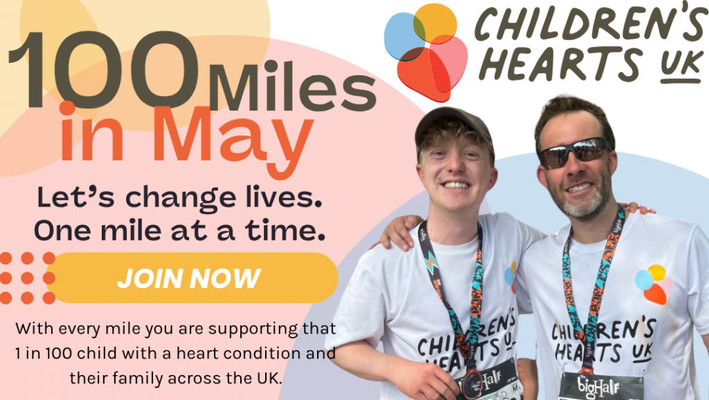 We’re welcoming people of all ages and fitness levels to walk, roll or run 100 miles throughout the month of May to help us raise awareness of the 1 in 100 babies that are born with a heart condition